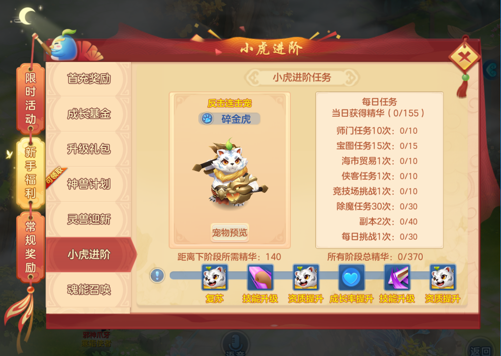 2)新增了碎金虎进阶玩法,完成相关任务获取积分可提升碎金虎能力。