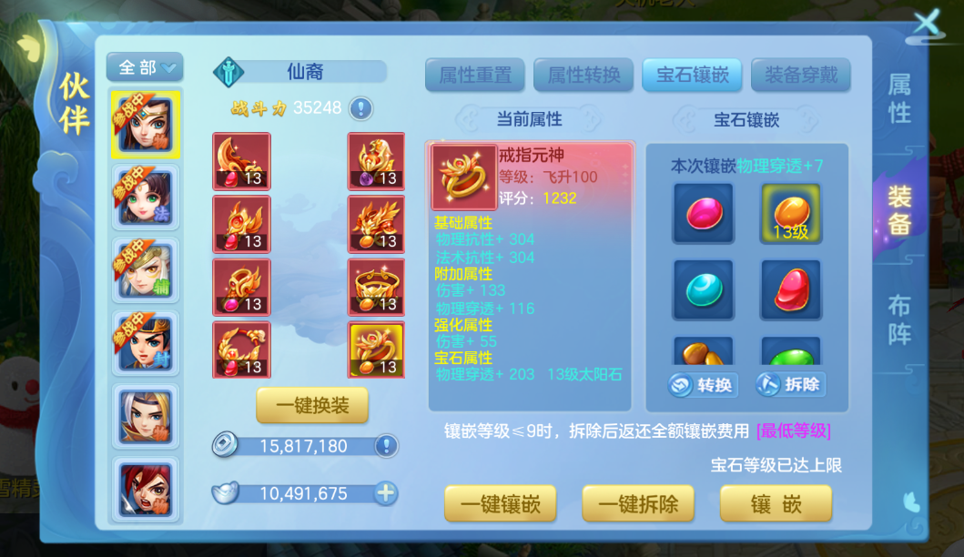2、等级≥飞升100级伙伴元神最高宝石镶嵌等级提高至13级,宝石镶嵌保护等级提高至9级。