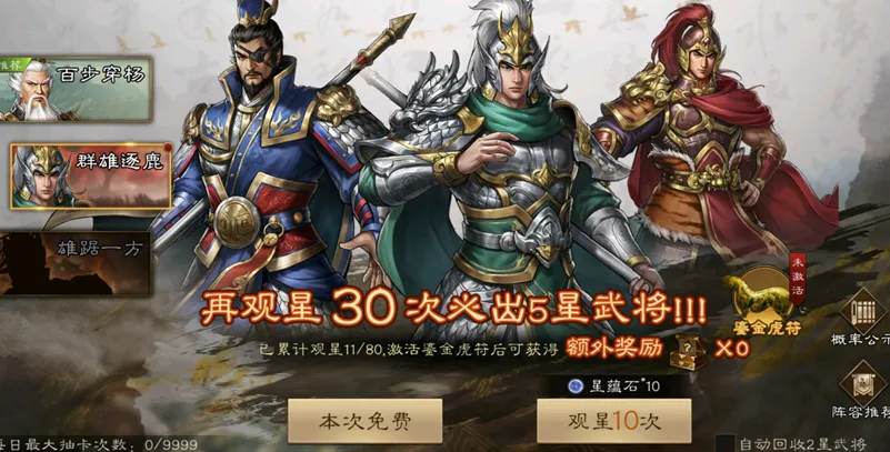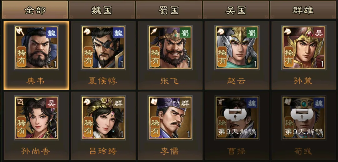 而例如在第3天可以选择的稀有5星武将,魏国可考虑典韦,蜀国可考虑张飞,吴国可考虑孙尚香,最后的群雄则可考虑李儒,当然以上这些选择也需要实际结合到大家的前期抽取情况来综合分析,并不能完全一言以概之,还请大家参考即可。