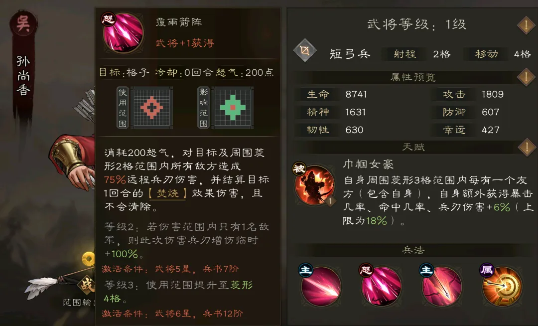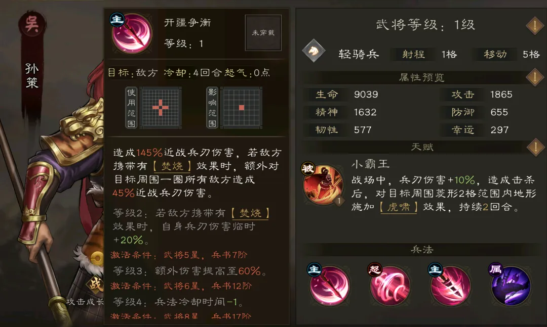 第三部分则是吴国阵营,此阵营测更加强调以“焚烧”dot体系与“虎啸”地形辅助来连打输出,例如其主C小霸王孙策就同时具备了焚烧施加/增伤与铺虎啸地形的能力,而这种将赤壁和夷陵的烈火与江东之虎所联结起来的特色也颇为符合吴国阵营的历史印象。