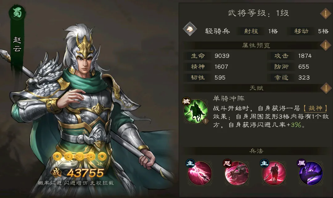 最后的子龙将军则是主打闪避输出和暴击爆发,长坂坡之战中那七进七出的神之壮举,万军从中过片甲不沾身的游龙战绩,这种设计思路也是很好的还原了赵子龙在演义中的表现!