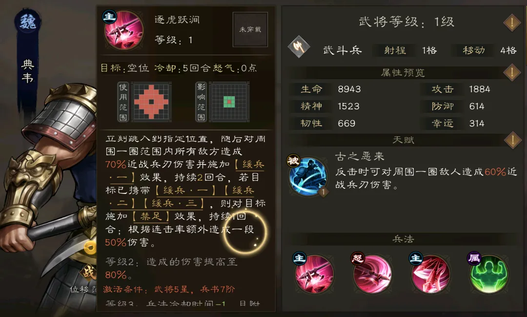 接着魏国队的另一位大C典韦则也具备着按照自身的连击几率来追击伤害的能力,且其在对敌方输出时还能对其施加移动力降低或定身等效果,这也能更好的配合夏侯惇等主C来打出不俗的伤害,此外这个跳大的特点也是典韦的一大差异化特色,能给魏国队带来更大的容错率。