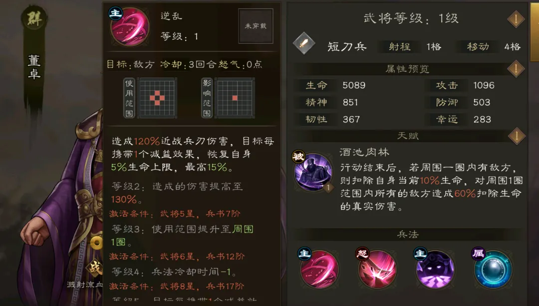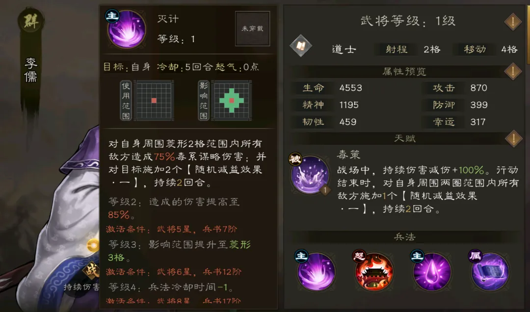 这时咱们就要搬出泼脏水大师李儒了,其不仅天赋可以给对方施加随机debuff,且技能也能给对方群体大量的随机与定向debuff,堪称整个群雄队debuff产量最高的角色。