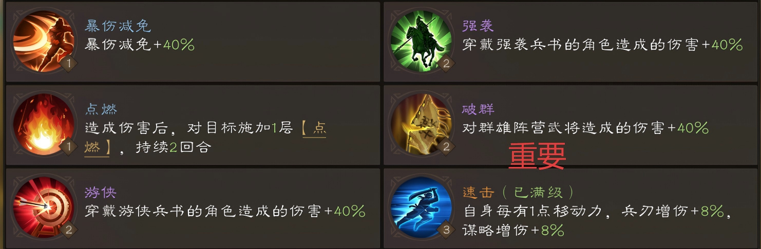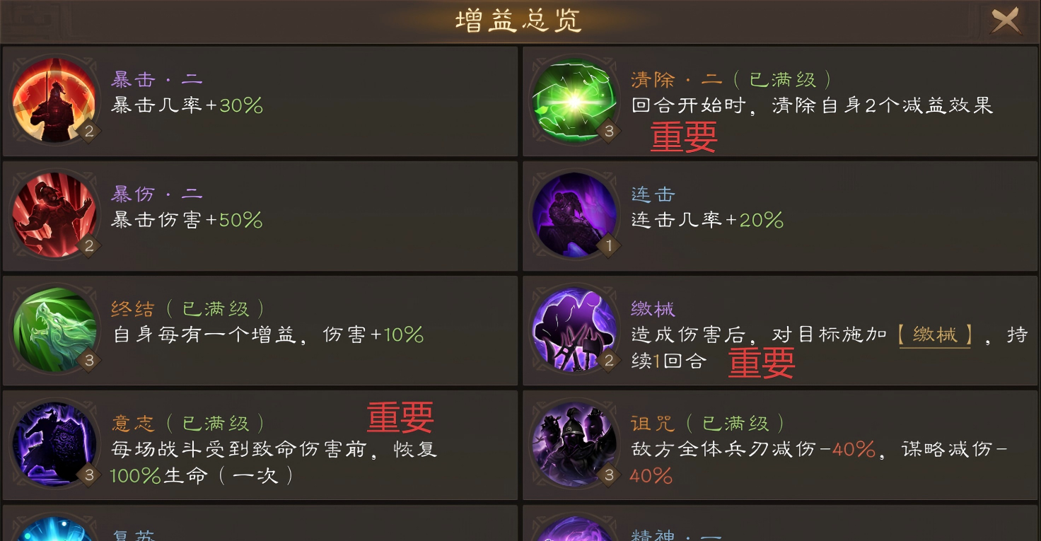 其他buff:对群雄英雄造成的伤害加40%/主力关羽选择暴击buff,主力夏侯惇选择连击buff,主力吕玲绮选择增加减益效果的buff/兵书增伤/+移动力,移动力增伤/+增益增伤等