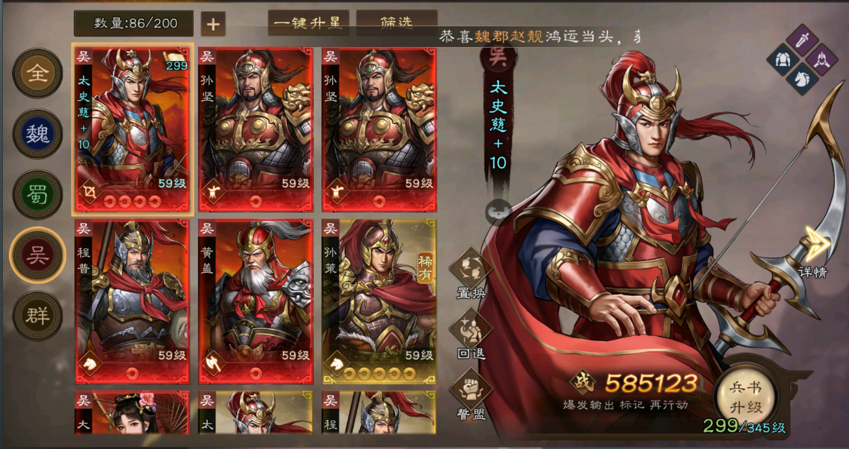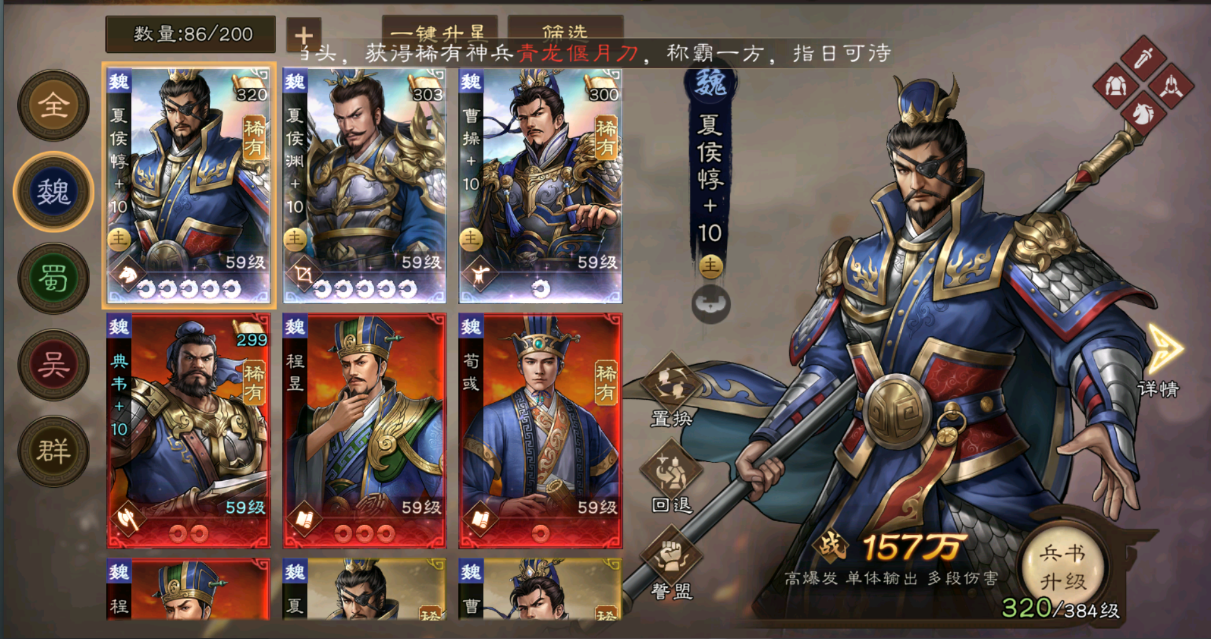 从当前版本来看,夏侯惇、夏侯渊、吕玲绮、关银屏无疑是T0级别的强力武将。因此,观星活动主要集中在曹魏阵营。