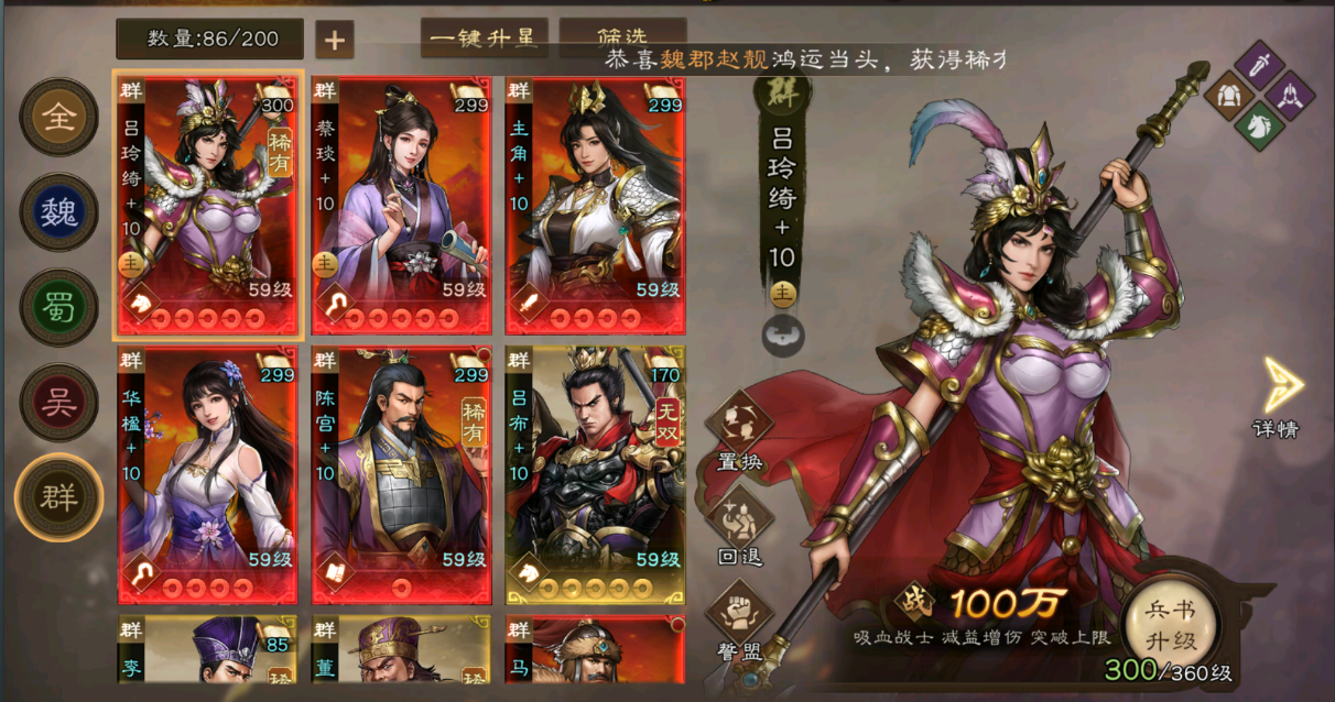 - 吕玲绮属于群雄阵营,狗粮资源充足,能够快速培养
