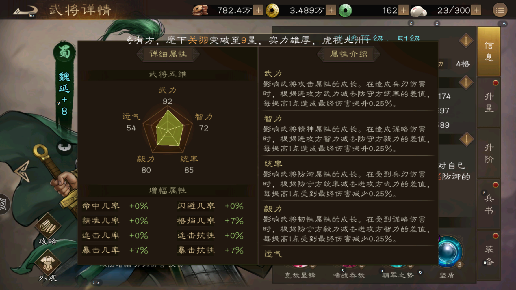 魏延做为蜀汉后期第一武将,游戏里设计成了防御为主的角色,从五维看 武力值属于T1级别,统率决定防御属于优秀级别,毅力低决定法防属于优良,运气值决定了魏延的原生暴击率一般;