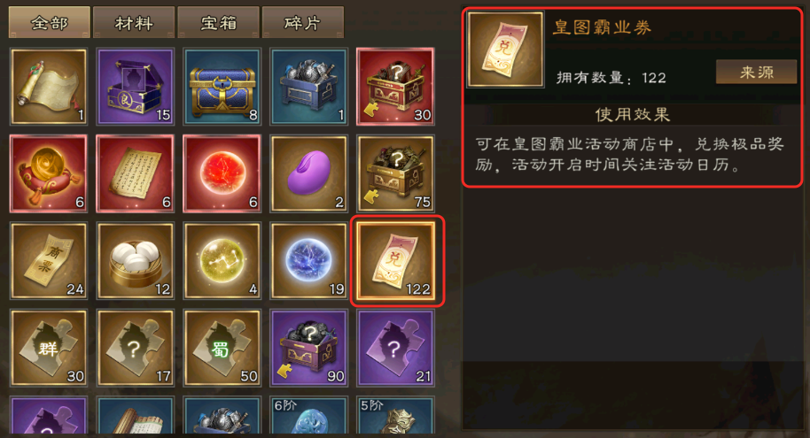 细心的玩家会发现,皇图霸业券可以在平时获取,且只在活动期间消耗。这意味着: