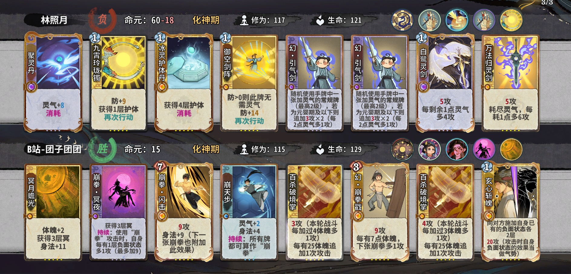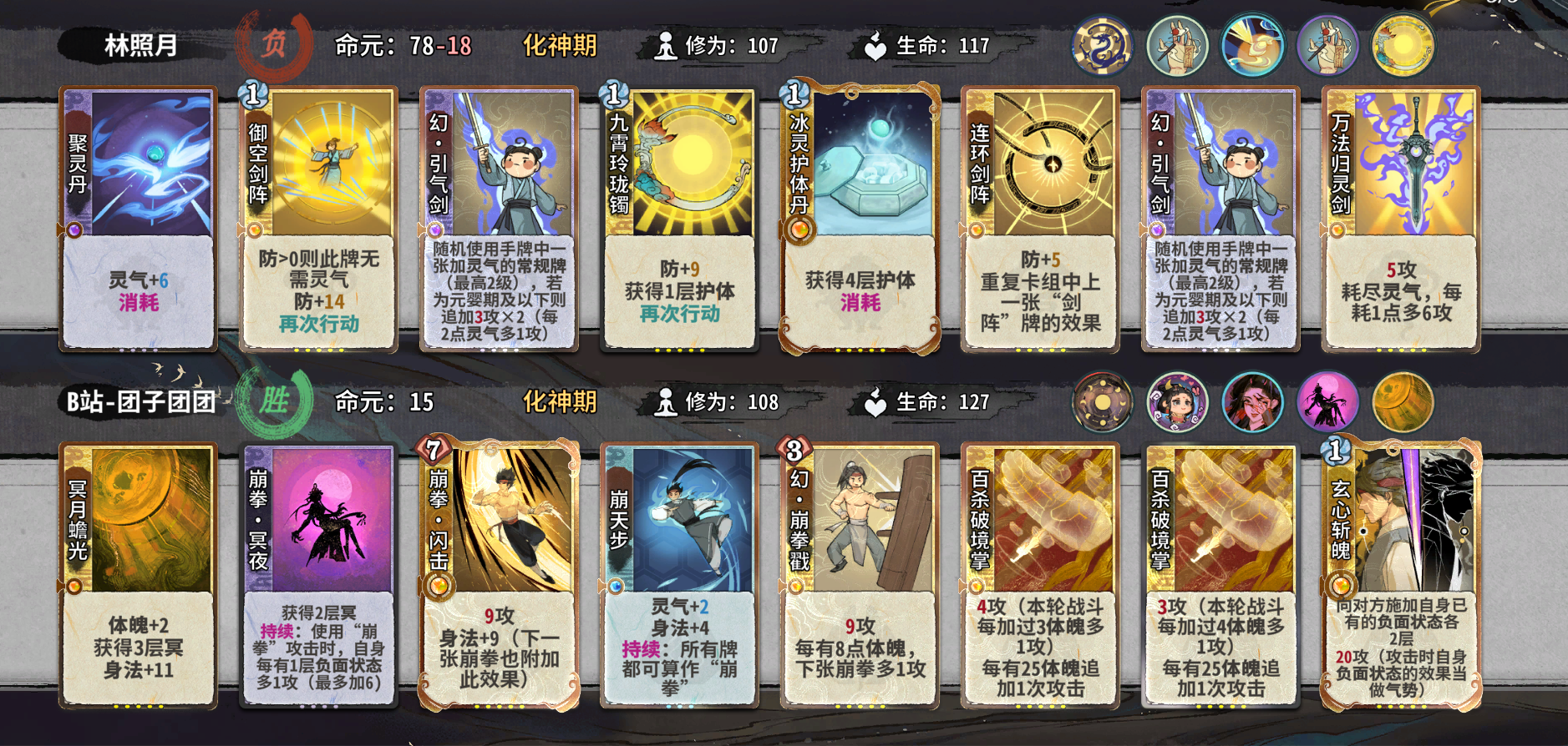 化神时最讨厌的事情就是,想在消耗牌用上聚灵丹和聚灵心法,但是每次都是一级聚灵心法或者一张二级聚灵心法一张一级聚灵心法,这个时候如果上一张二级,手上留一张一级有大概率引气到聚灵心法上,这样会导致灵气增长特别慢,从而输掉对局,这时候要么咱们上两张,要么炼化掉一张一级。我建议是炼化掉,为了三级的两点灵气去赌,万一输掉扣18血是很难受的,可能最后就差一血就能多苟一轮。
