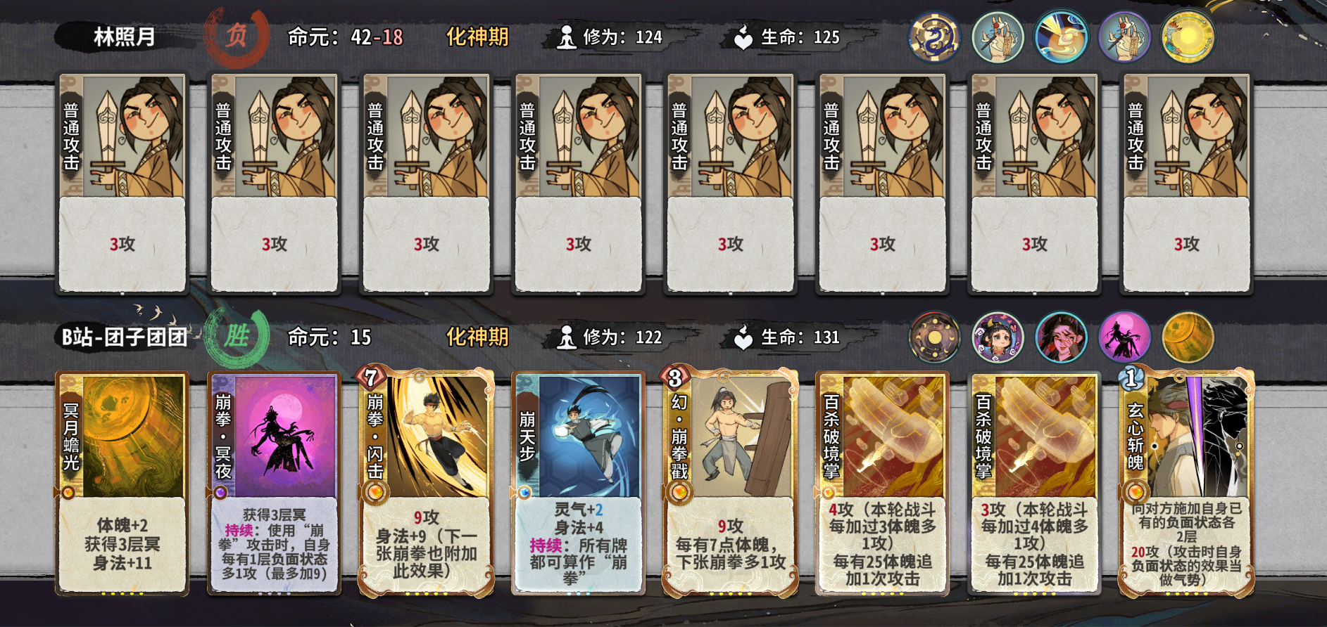 第三轮对方猜到我要二动护体,他也变阵用百杀打掉我的护体,然后崩拳戳加百杀把我秒掉