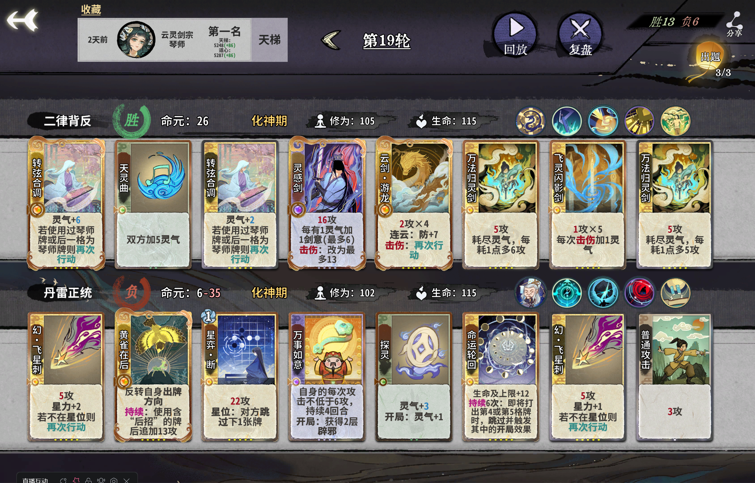 化神:一般为12轮上本,有顿悟和事件修为可以11轮上本,12轮开始,即使有慈念曲一般输了也会打到18点龙鳞上限,可以扔掉慈念上本,上本后通过剑阵和灵剑的来回切换搭配对策卡对局,因为剑阵和灵剑都具有比较高的强度,且本赛季大部分卡组速杀能力降低,只要把对面忽悠瘸,吃鸡唾手可得。