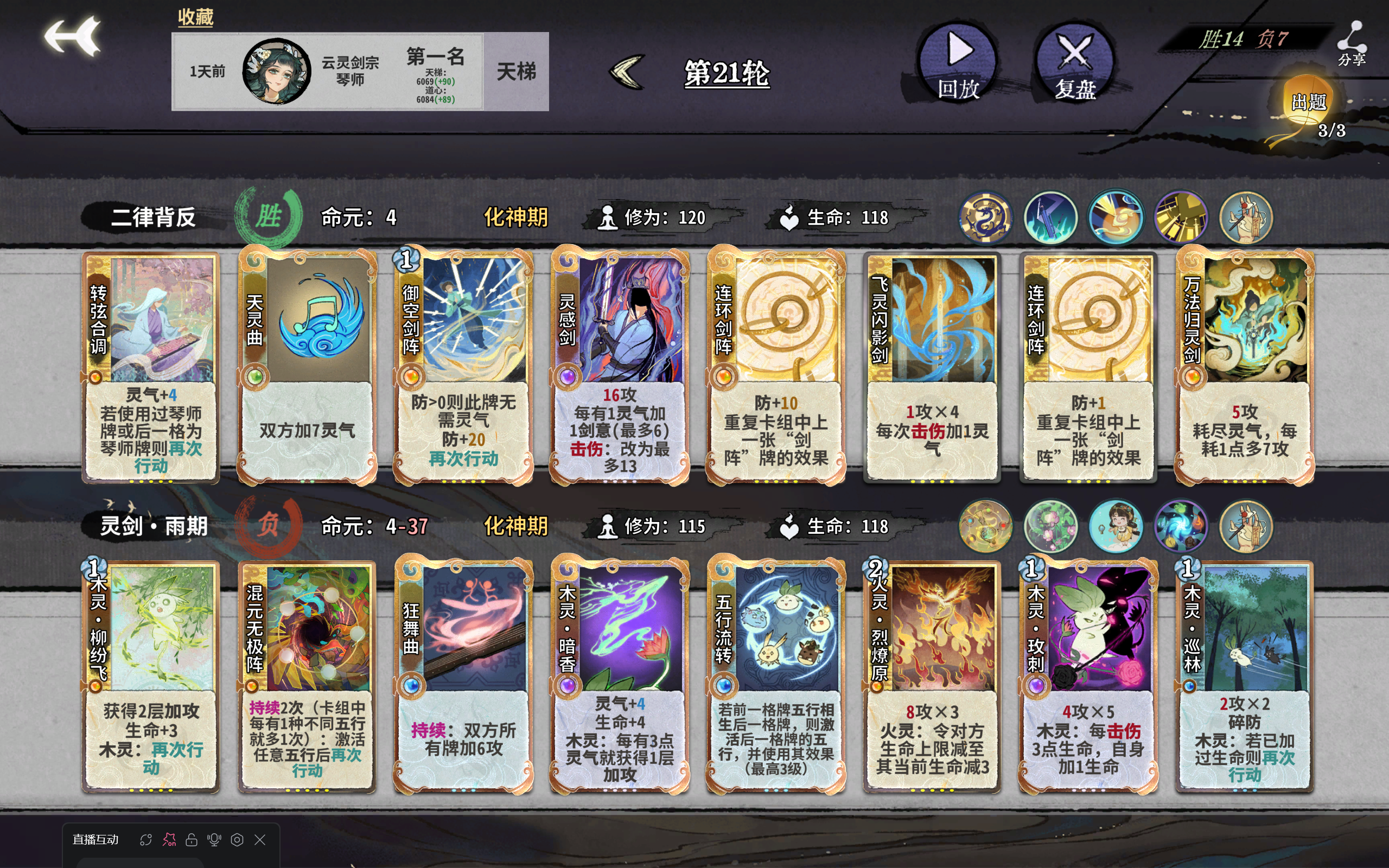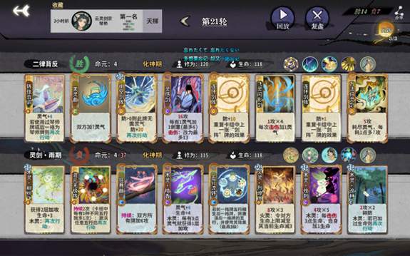 中期事件:有删牌事件删灵犀,扣命元升级牌升级幻音,扣命元加换牌次数的自行考虑,加命元事件和加换牌次数事件怎么贪怎么来就行,比如-3换牌次数+10命元,如果是5-7轮触发,换牌次数用光等于白嫖10命元,逍遥仙事件空两张+4生命上限,因为我们筑基战力强,有这个余力,加修为事件自行考虑战力,其余生命上限事件,用生命上限换命元,换牌次数,或者其他资源,都是好选择,当前版本因为提供大量资源,输出都是超标的,很少有很敏感就差这几滴血的对局,而且也有白嫖生命上限事件,所以用生命上限换其他资源都是好选择,扣命元事件则酌情考虑,因为我们有龙鳞和慈念,所以每18命元都是一轮容错,不能轻易掉,比如这一把,一路顺风到决赛,事件给予的大量命元让我能输六轮,而对面一把都不能输,很多时候,容错就决定了能不能第一,有容错就是对面猜我们阵容,没容错就是我们猜对面阵容。