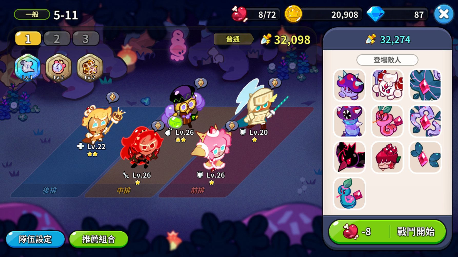 6、搭配阵容:前期阵容可以侧重输出型,后期可以适当加入一些防御型饼干,尽量兼顾各项属性。