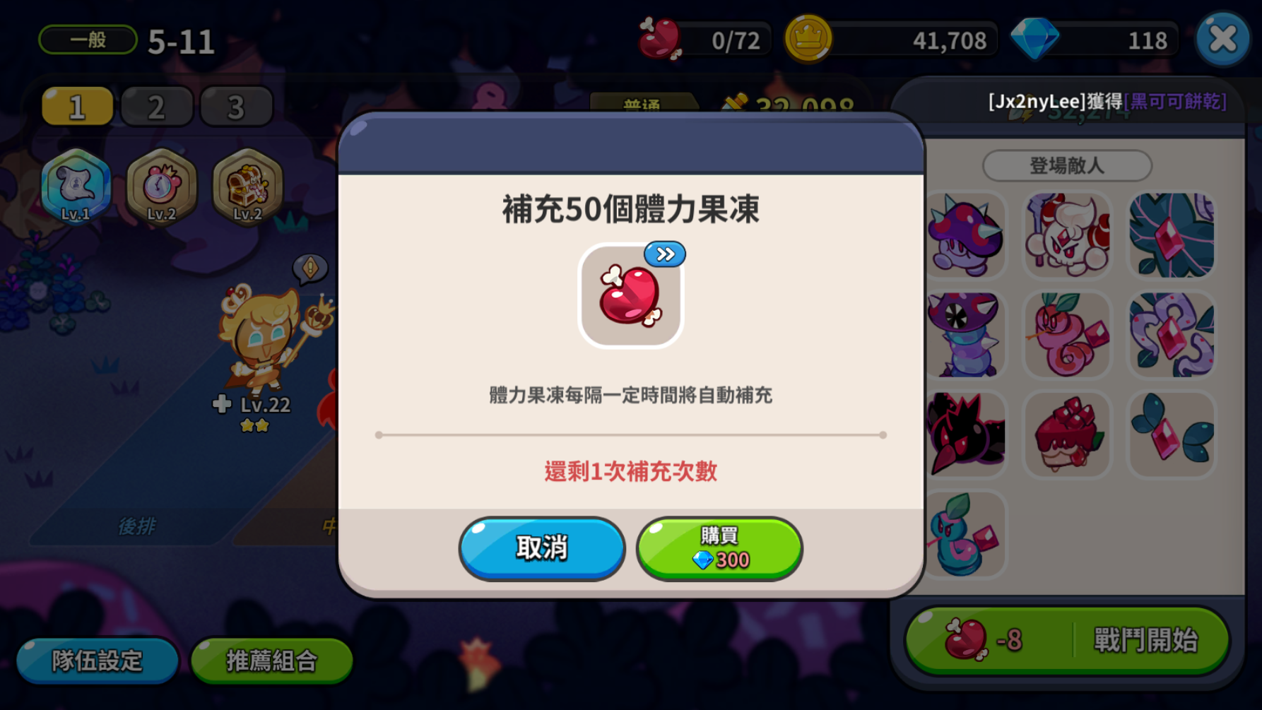 4、体力机制:需要消耗一定的体力果冻才能进入战斗,中途退出会返还所有的果冻,若通关就会完全消耗。