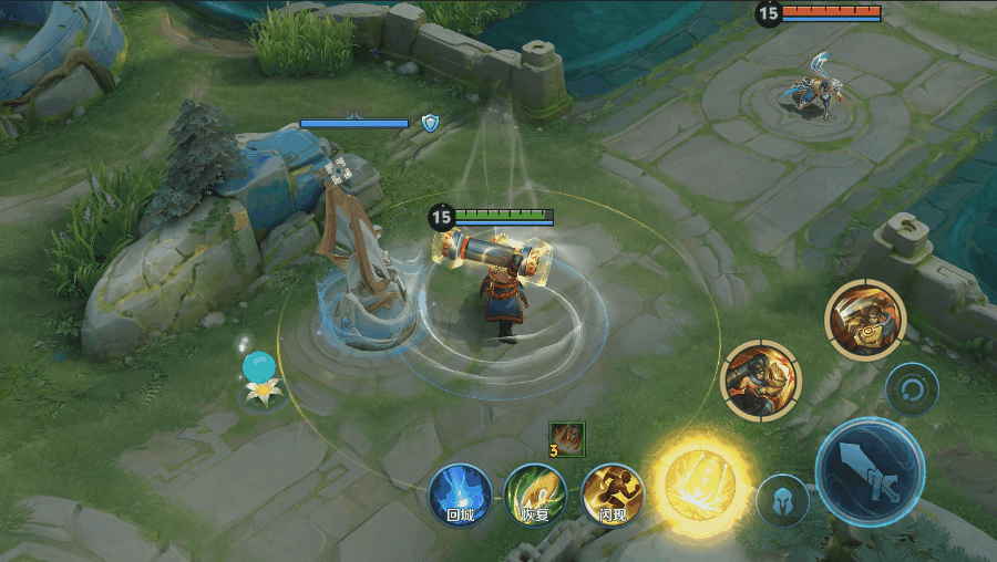 召唤元流重盾朝首个被攻击的敌方英雄目标区域造成物理伤害与0.5秒击飞效果