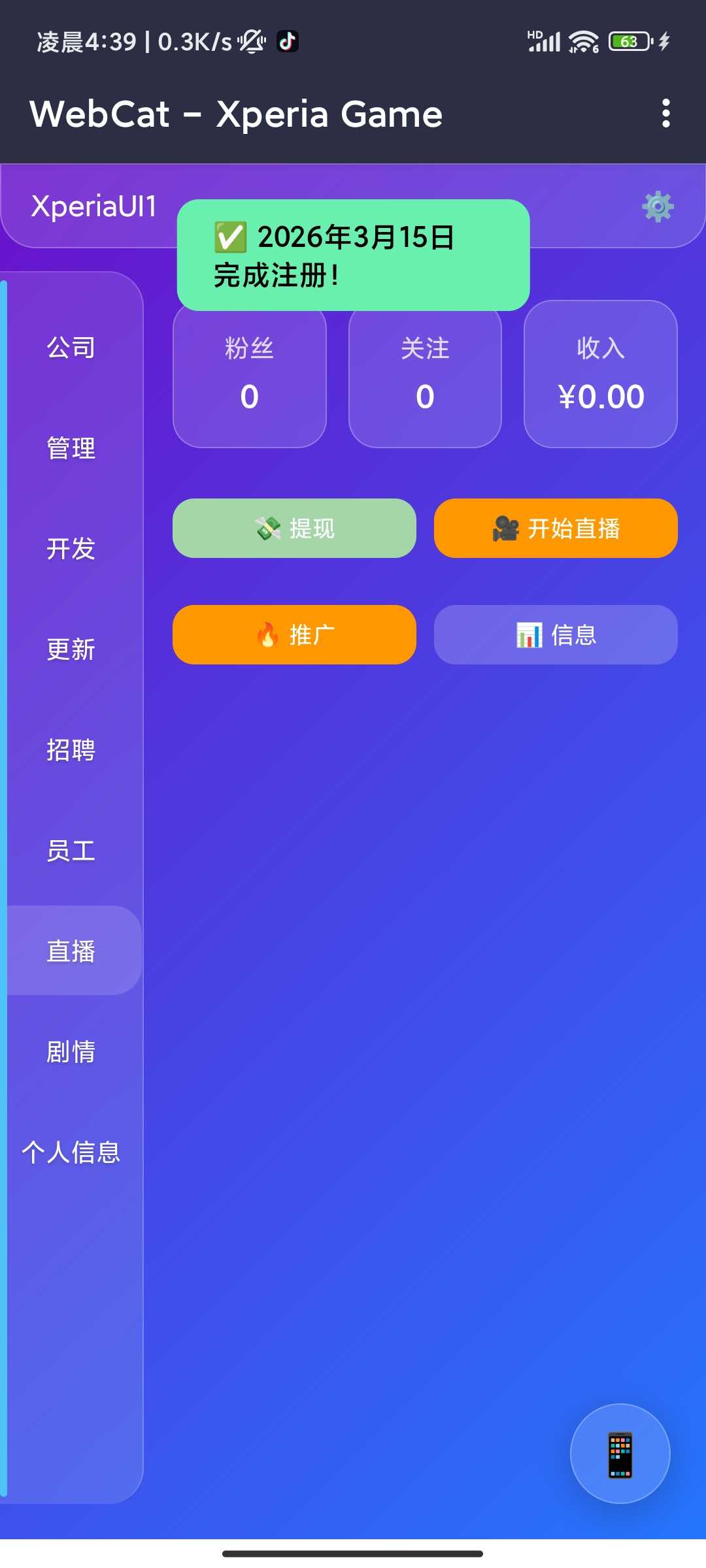 2026/3/15 版本:1.0.0 游戏完整 直播已经完成百分之40 其他完成百分之0 更新 无 修复 无 1.0.2,更新2025-3-16 添加推广5号 修复推广提升不明显 添加剧情5个 主剧情5个