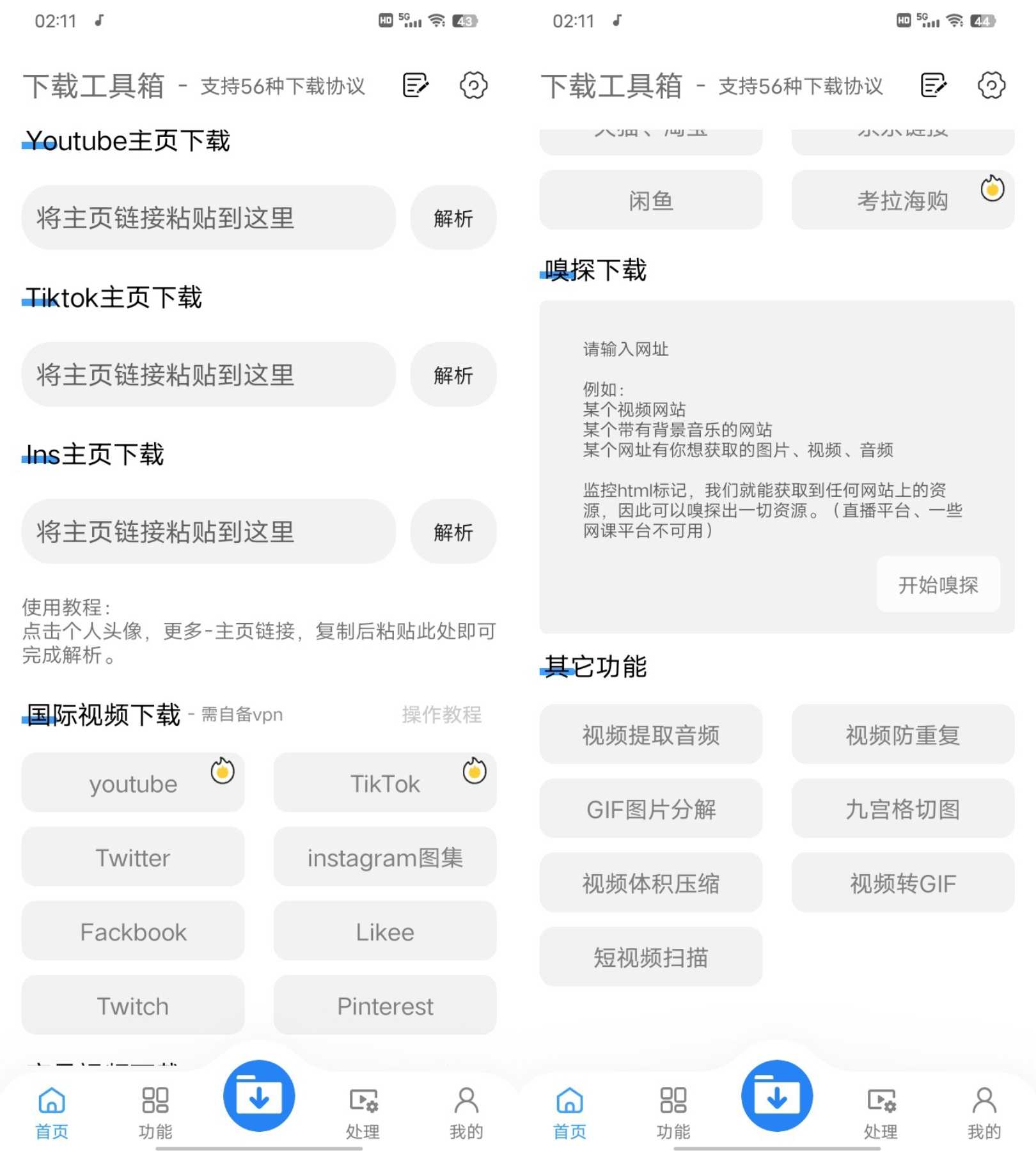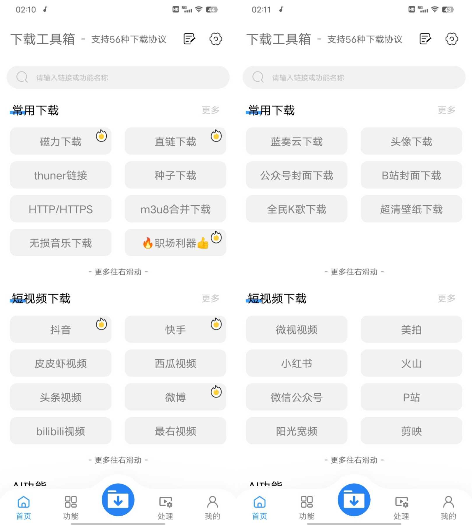 下载器工具箱是一款集全网视频下载、智能视频处理、AI增强创作于一体的多功能工具软件。它支持抖音、YouTube等国内外超过56种平台的资源下载,并提供智能边框、消重、补帧、倒序等视频优化功能,搭配AI换脸、去水印、PPT生成等实用工具,帮助用户轻松完成从获取、编辑到创作的全流程,是短视频创作者、内容下载者和日常用户的高效助手。